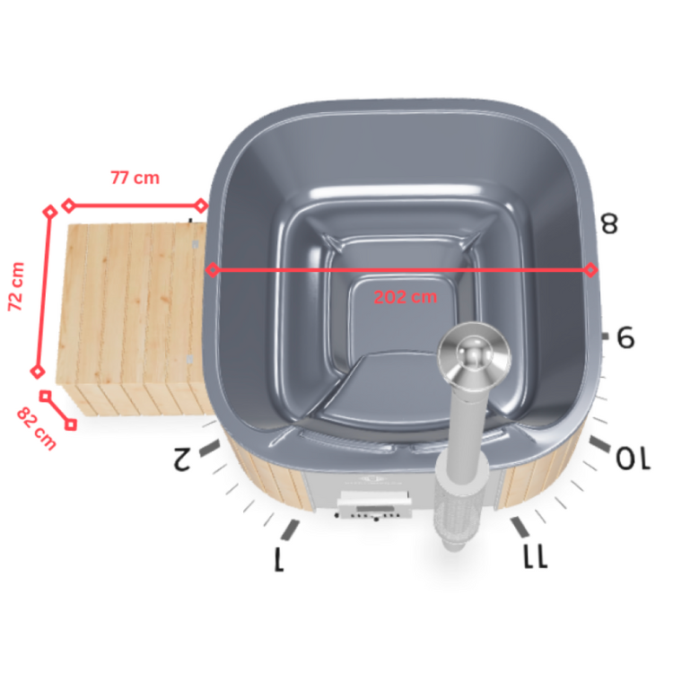 Zusätzliche Konfigurationsmöglichkeiten umfassen eine effektive Acryl-Wannenisolierung (einfach oder doppelt), eine werkseitige Holzbehandlung, Edelstahl-Spannbänder und eine optional erhältliche Premium-Thermoabdeckung.