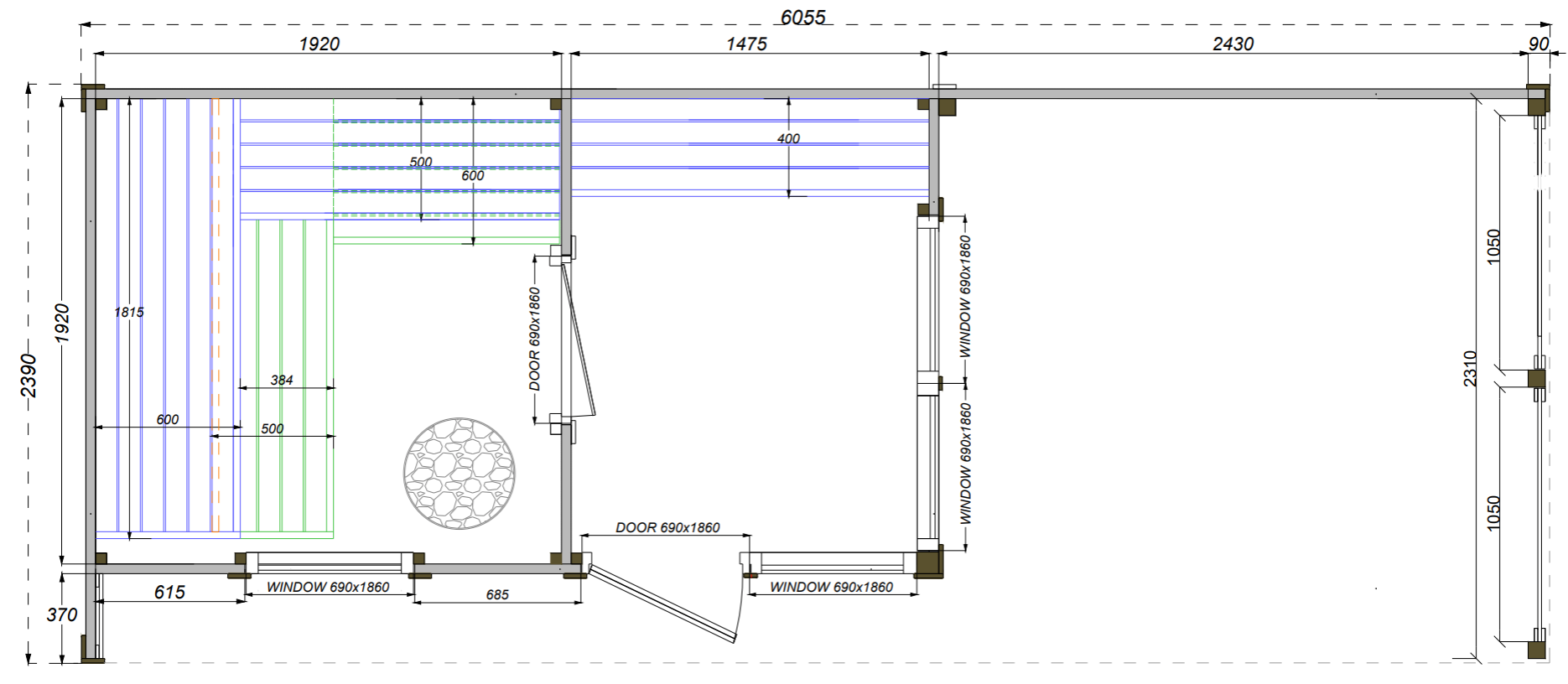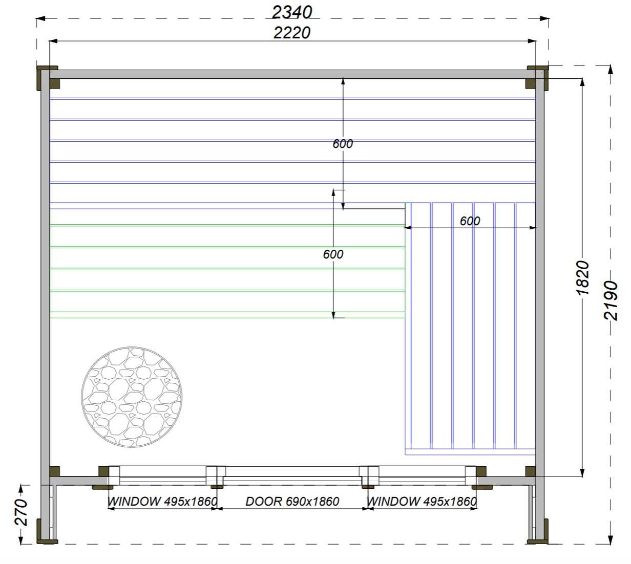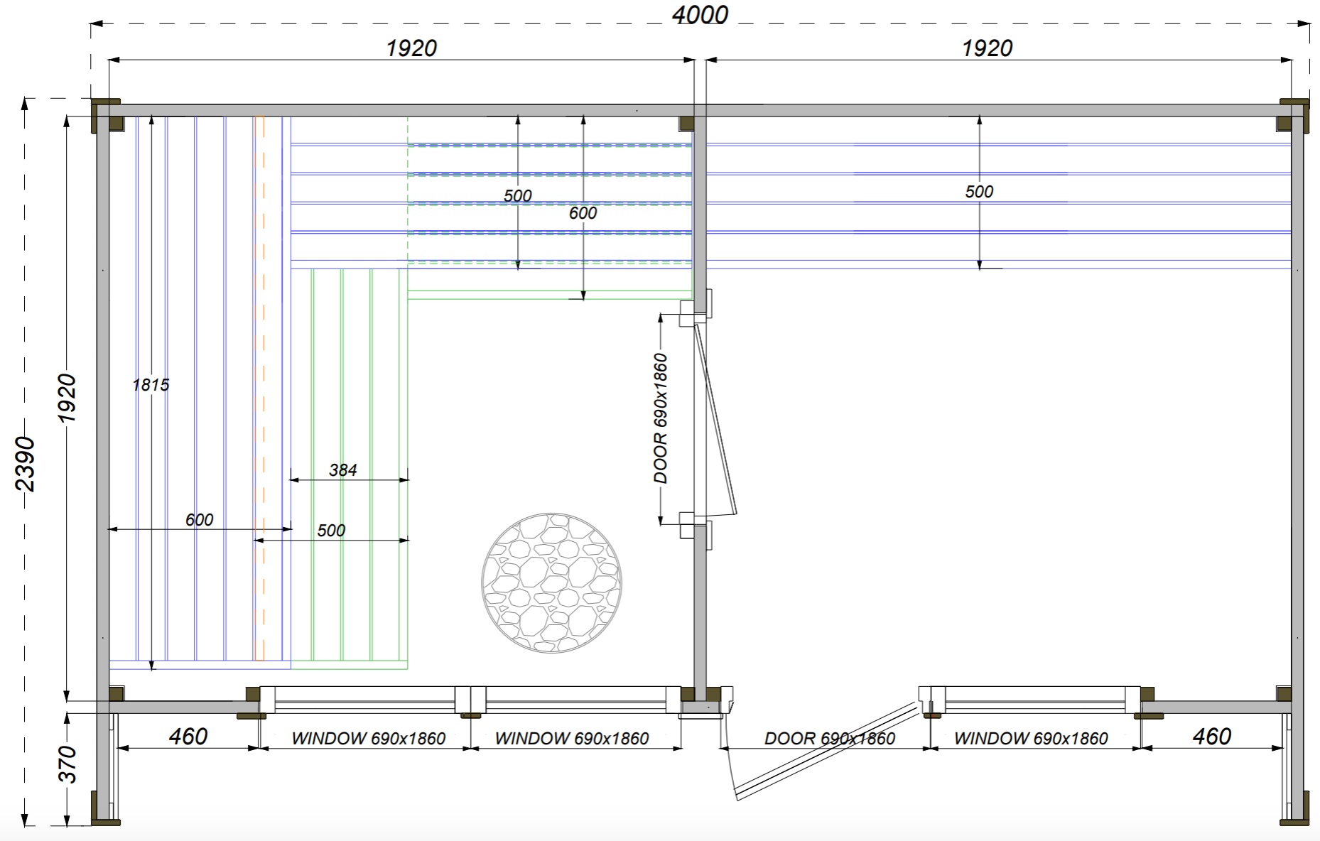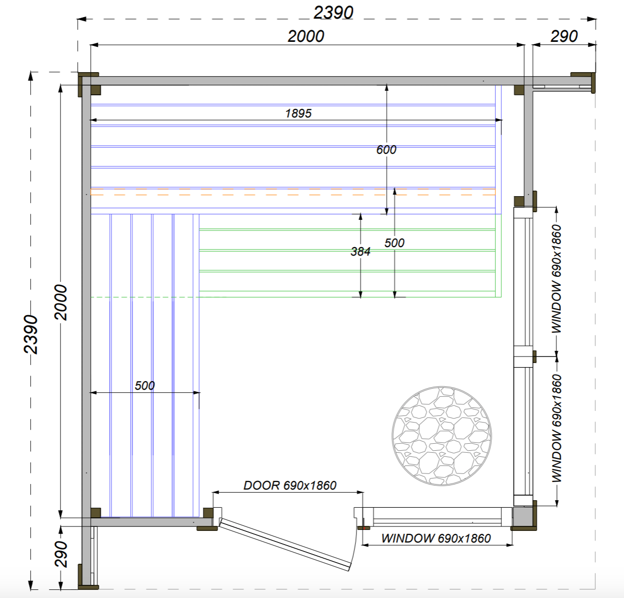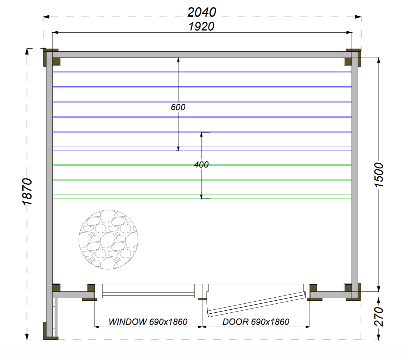 - Saunawände aus 40mm starken Massiv-Wandbohlen (Nut- und Federprinzip)